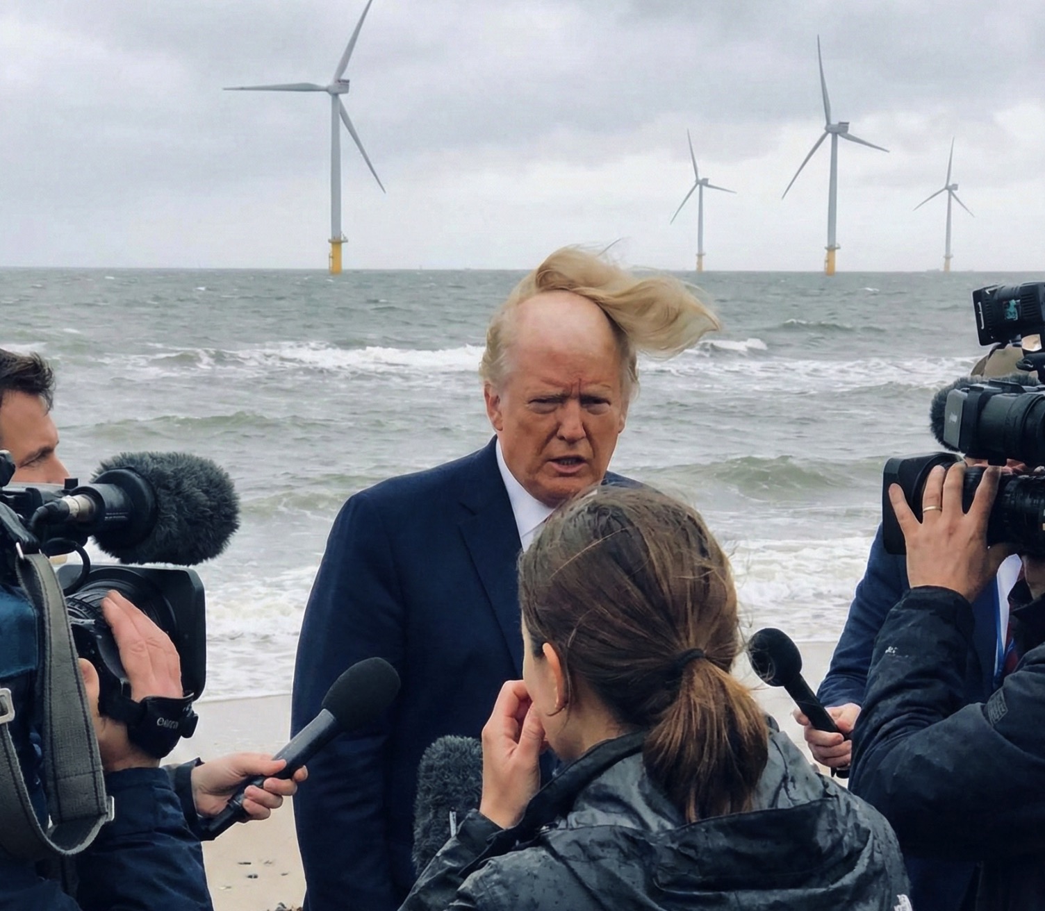 On May 13, 2020, during a televised briefing on the shoreline, a powerful gust of wind—intensified, according to the President, by a nearby offshore array—briefly detached his signature hairpiece in full view of the press corps. The moment was caught by several pool photographers, though the administration immediately labeled the resulting images as “AI-generated deepfakes” long before that technology was in common use.